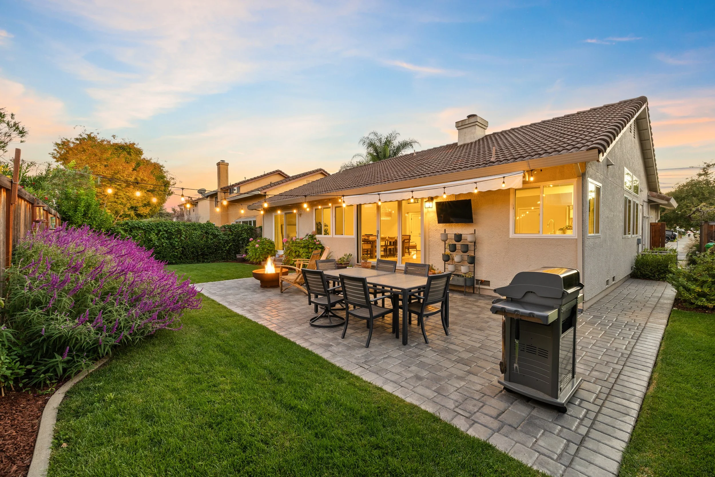 Backyard patio with outdoor dining table, chairs, a fire pit, string lights, a barbecuer, and a house with lit windows during sunset.