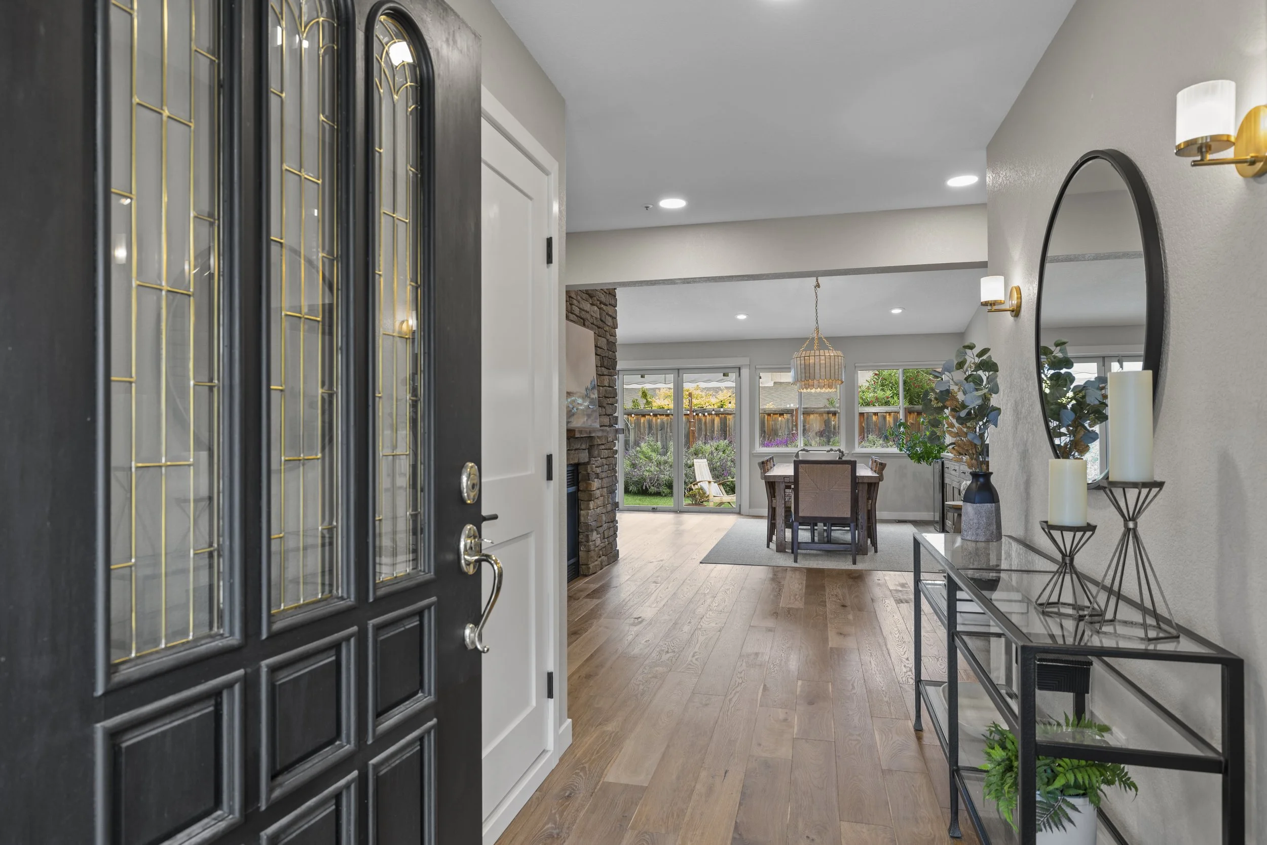 View from the front door into a bright dining area with large windows, a wooden table, chairs, and a sliding door leading to a backyard with grass and plants.