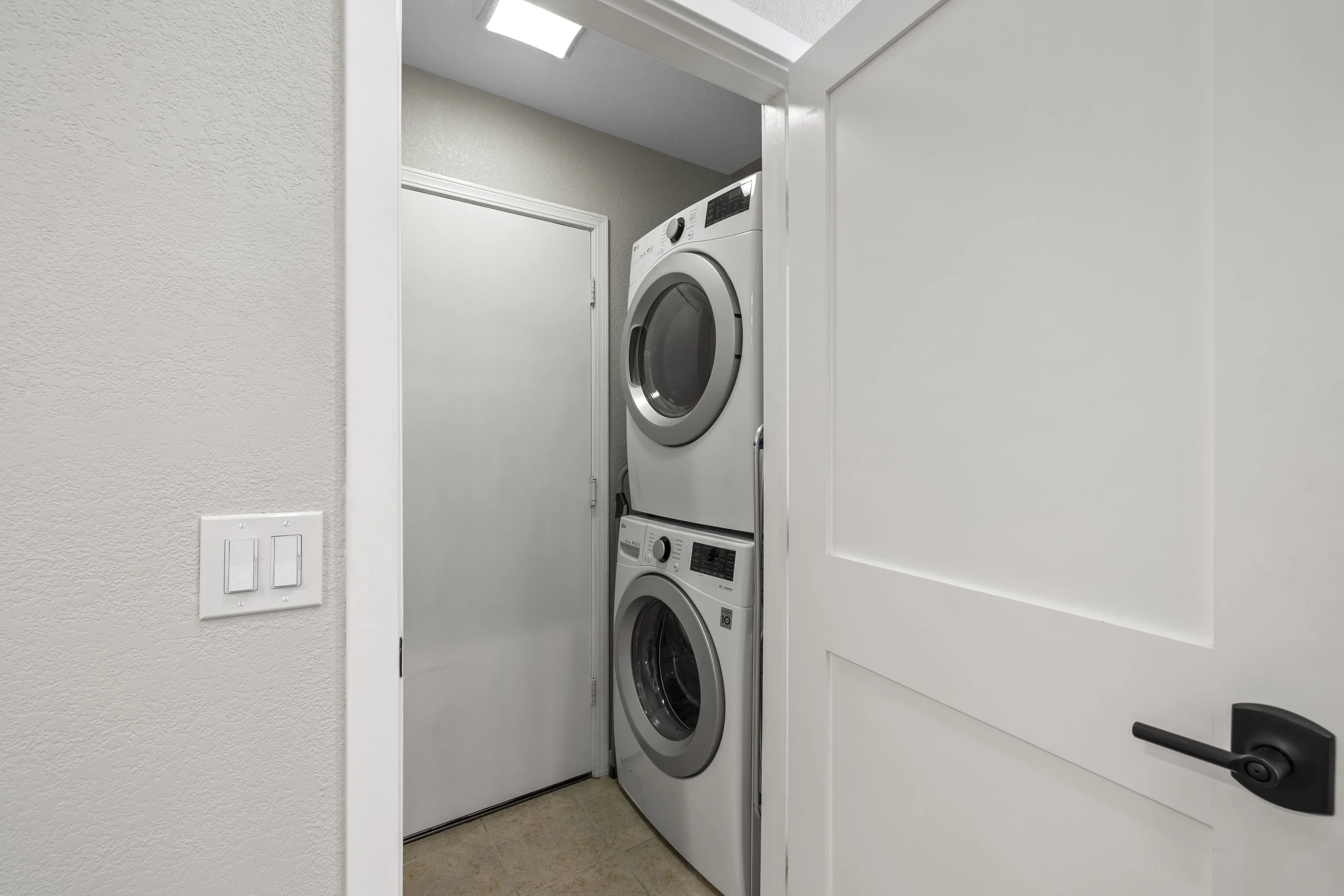 A laundry room with a stacked washer and dryer, white walls, a door, and a beige tiled floor. View fullsize