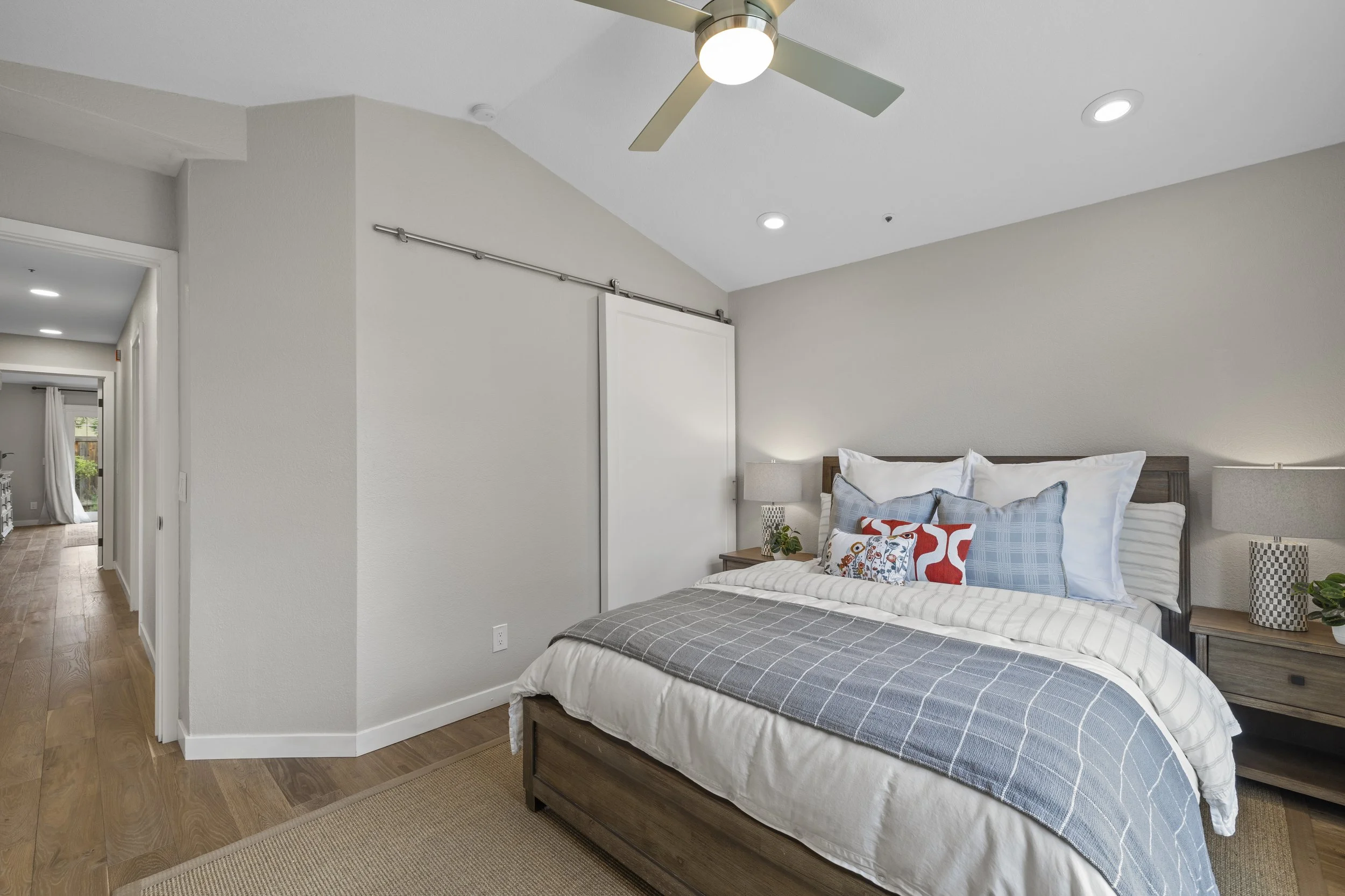 A bedroom with a king-sized bed, wooden nightstands with lamps, and decorative pillows. The room has light-colored walls, hardwood floors, and a ceiling fan.