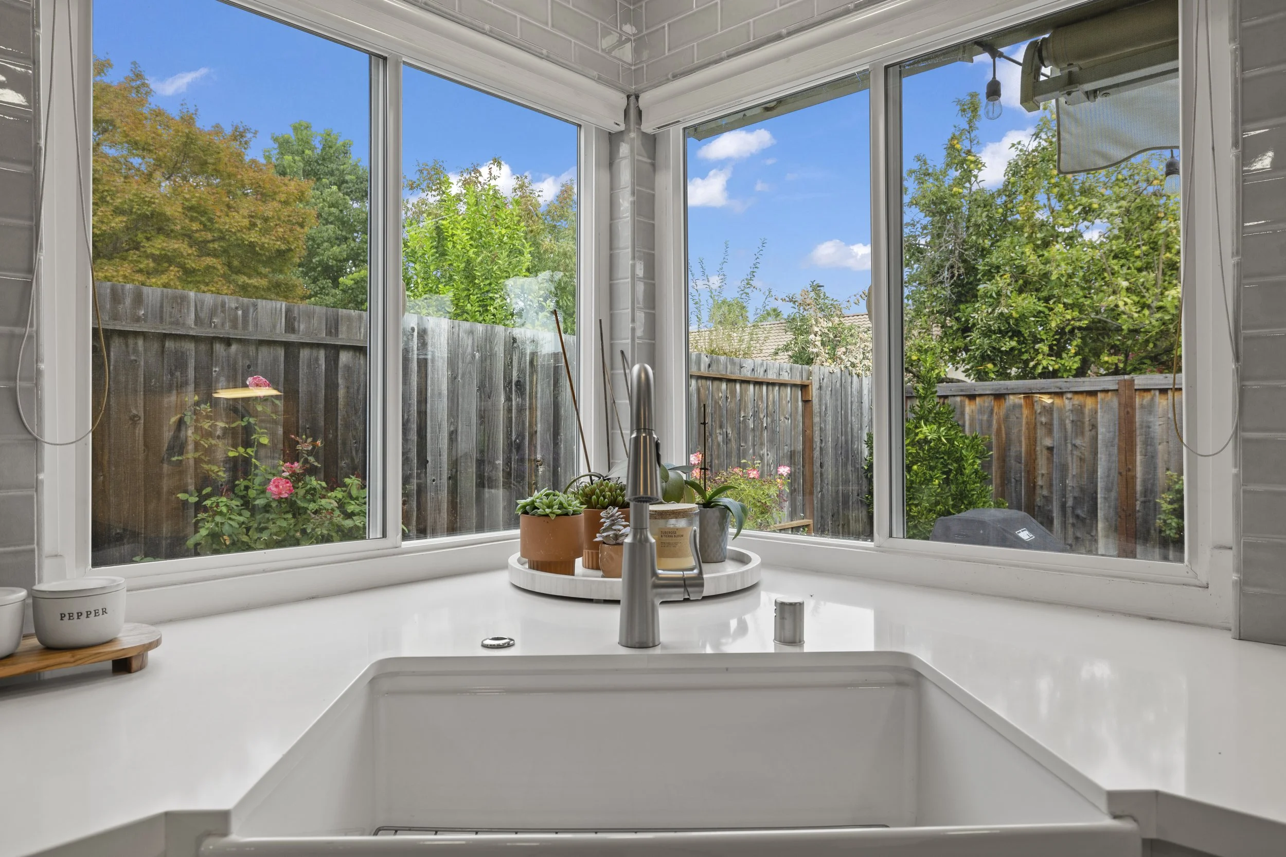 Kitchen with a white countertop and sink, large windows showing a backyard with trees, plants, and a wooden fence, and some potted succulents on the counter.
