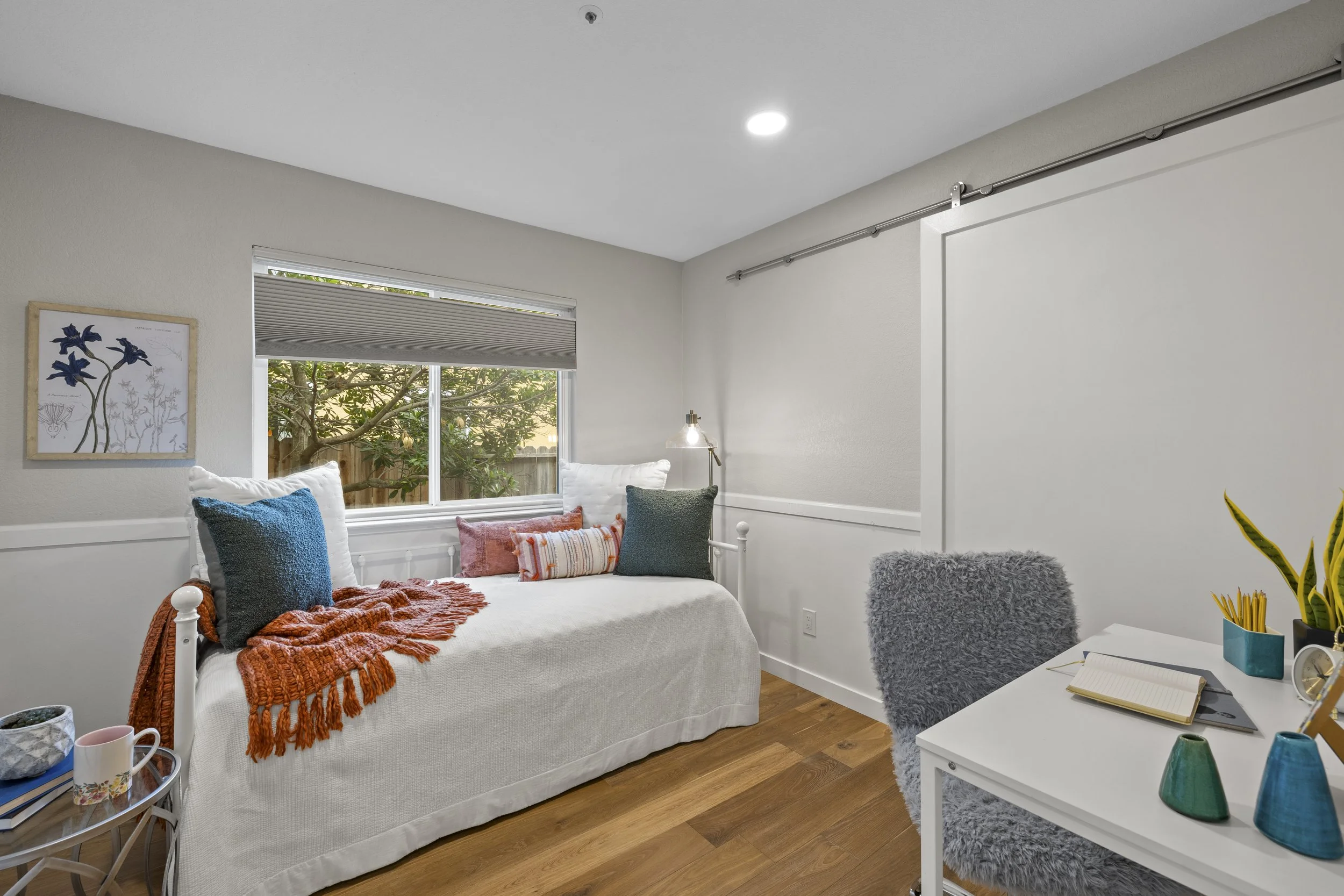 A cozy home office and sitting area with a white daybed adorned with colorful pillows and an orange throw, a large window with greenery outside, a white desk with a fluffy gray chair, decor items including vases, a plant, an open notebook, and a lamp View fullsize