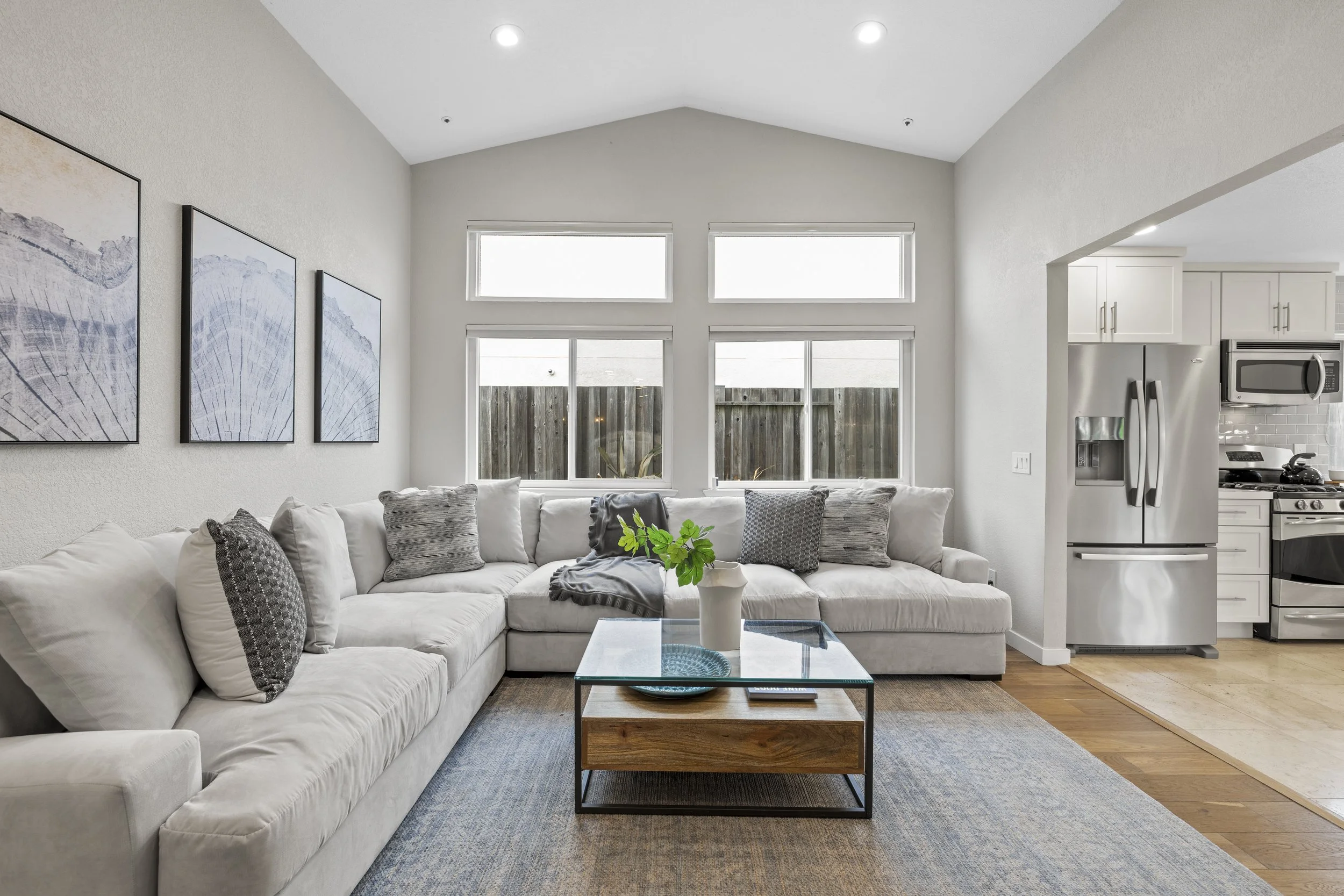 Living room with white sectional sofa, gray pillows, glass coffee table, and artwork on the wall, adjacent to a kitchen with stainless steel appliances.