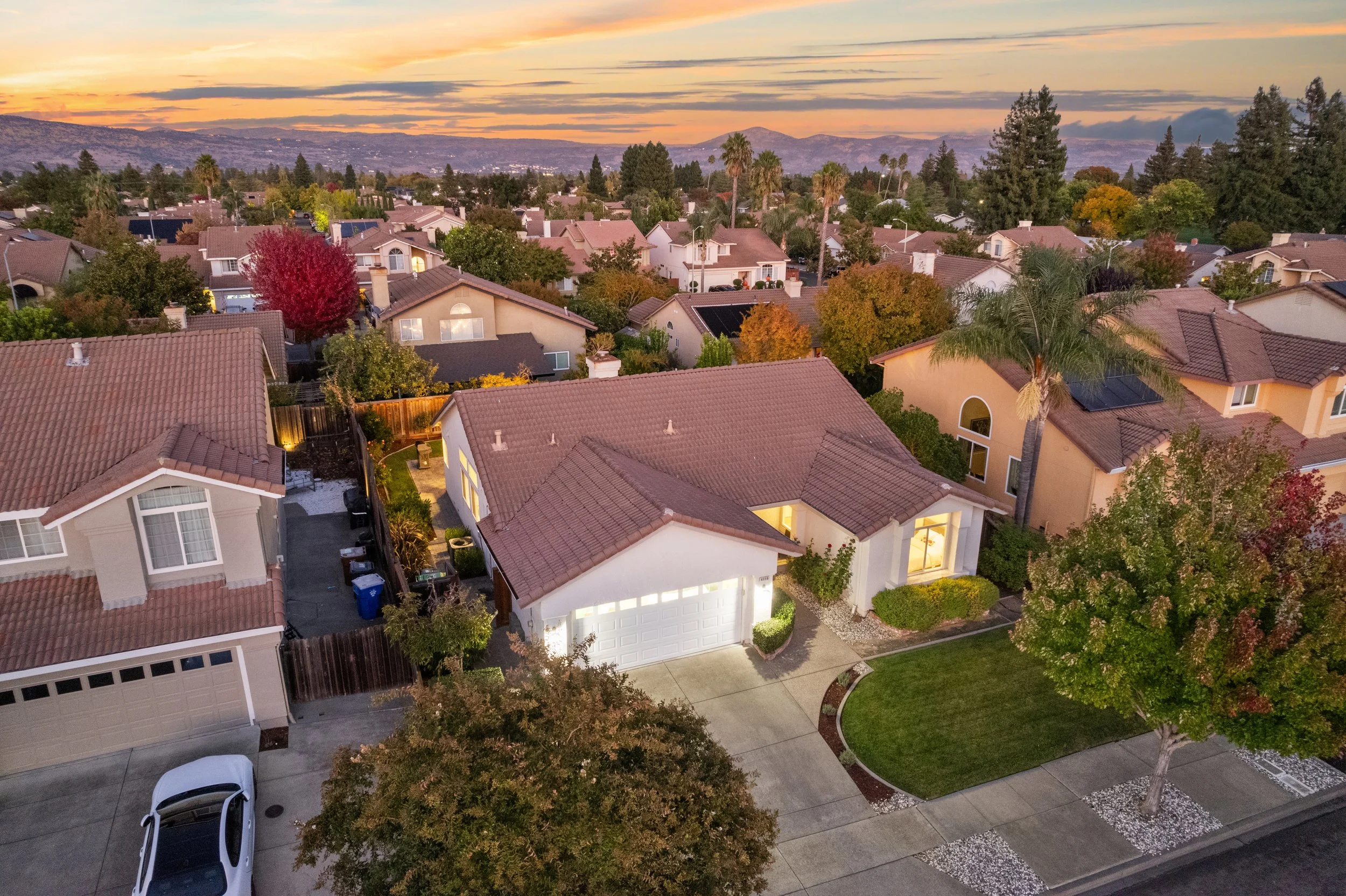 Aerial view of a suburban neighborhood at sunset with houses, trees, and mountains in the background. View fullsize