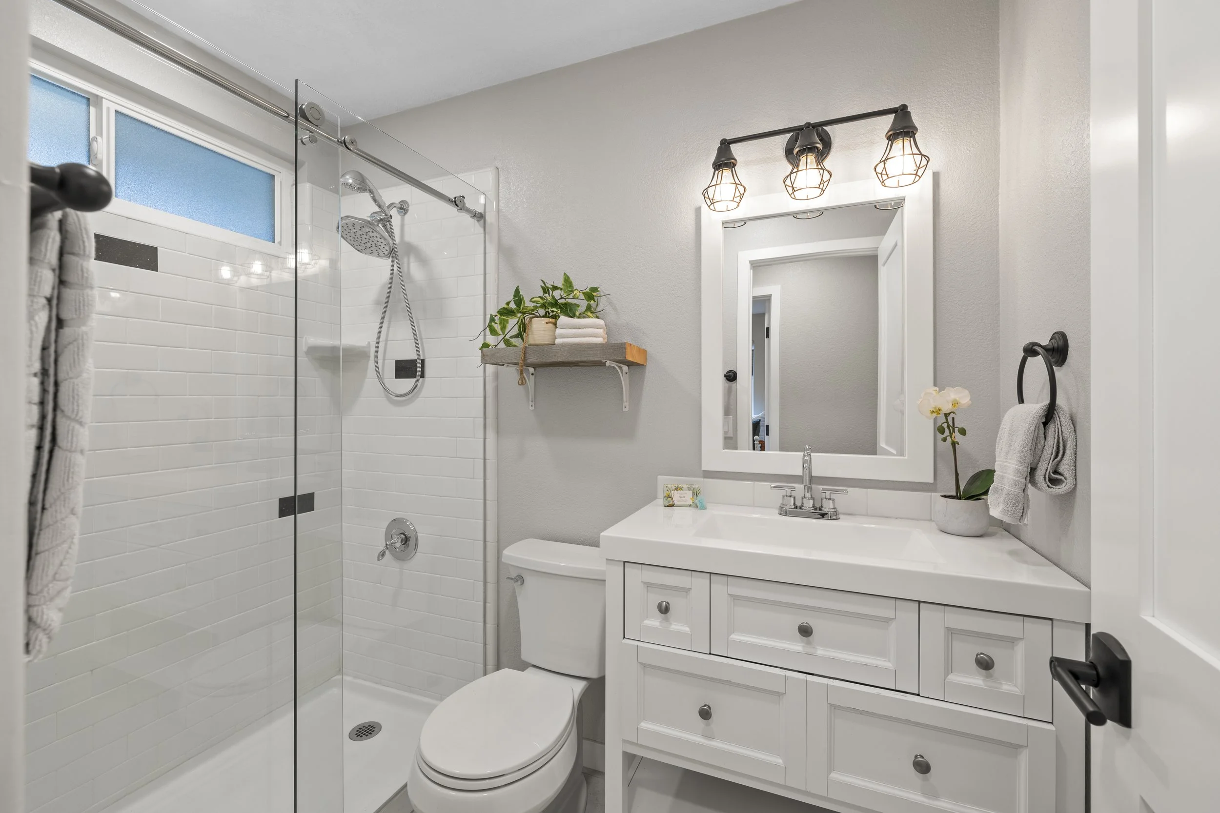 Bright bathroom with walk-in shower, white subway tile, small black accent tiles, white toilet, white vanity with silver knobs, large mirror with three industrial-style light fixtures, wall shelf with plants and towels, small potted orchid, gray towe View fullsize