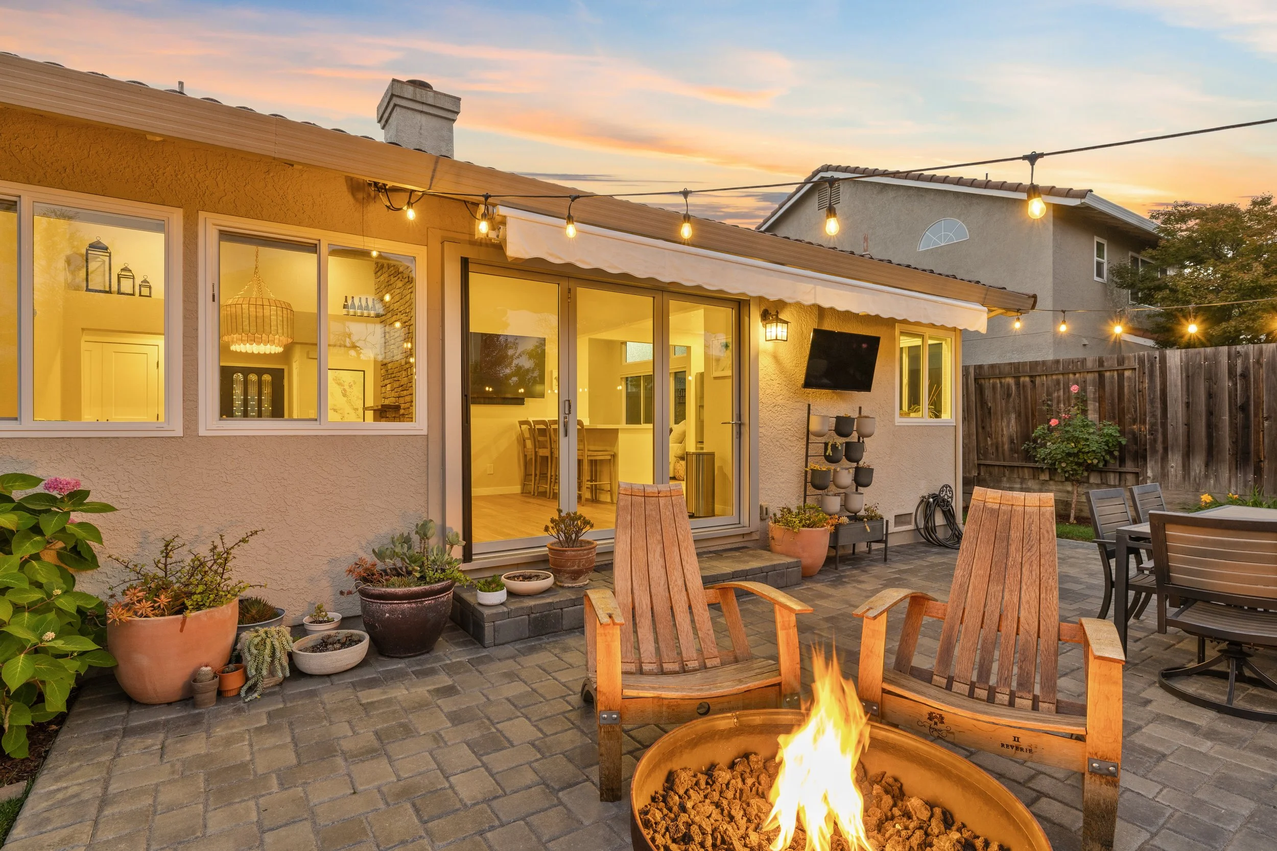 Backyard patio with a fire pit, wooden chairs, potted plants, string lights, and a house with large windows and sliding glass doors at sunset. View fullsize