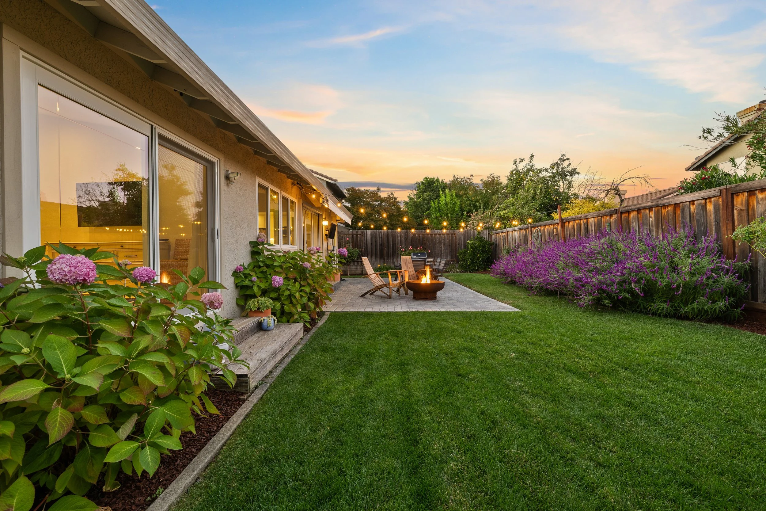 Backyard with green grass, potted plants, flowering bushes, a wooden deck, patio seating, and a fire pit at sunset. View fullsize