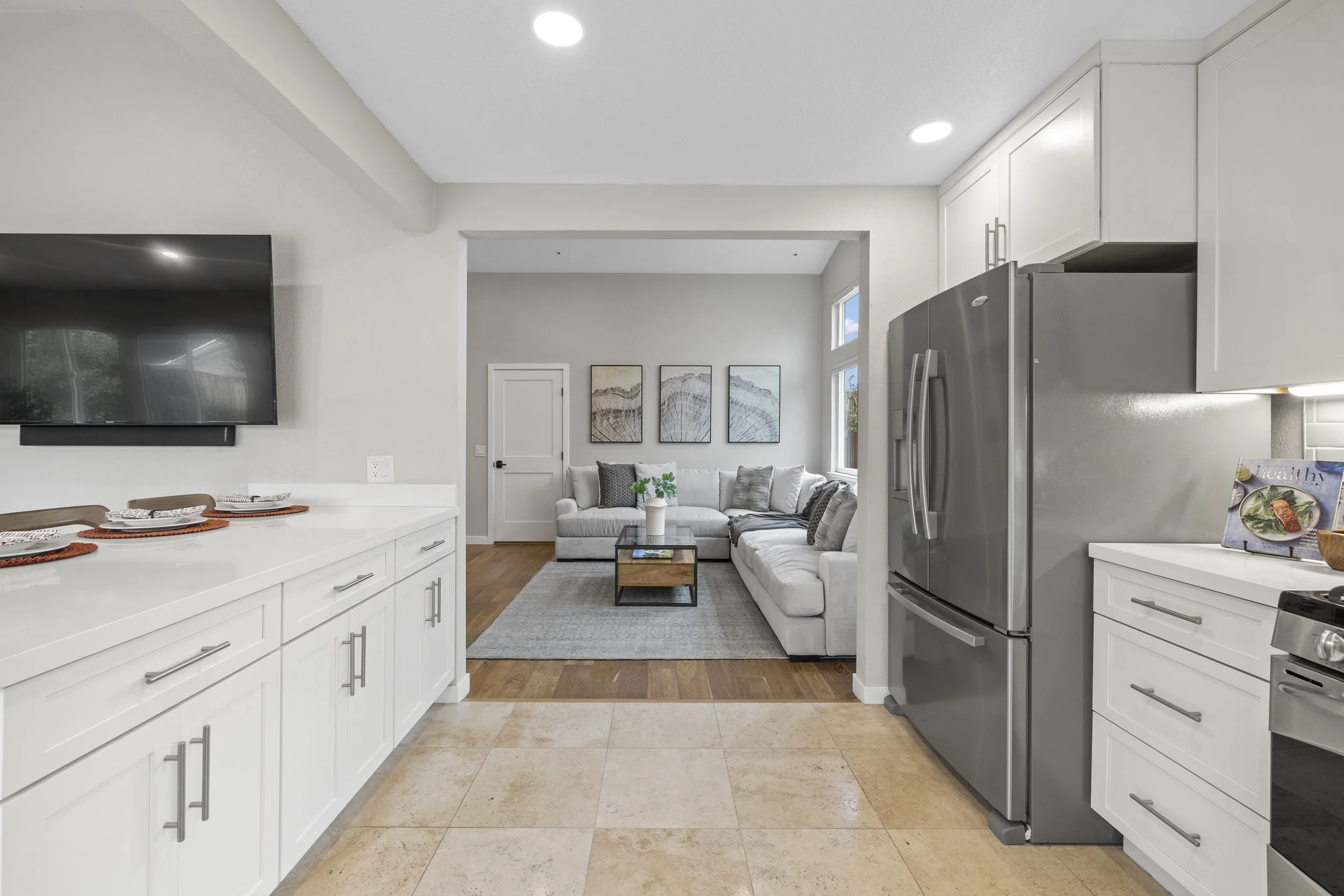 View from kitchen into living room, kitchen has white cabinets, stainless steel refrigerator, and beige tile floor; living room has a white sofa, wooden and glass coffee table, artwork on wall, and hardwood floor.